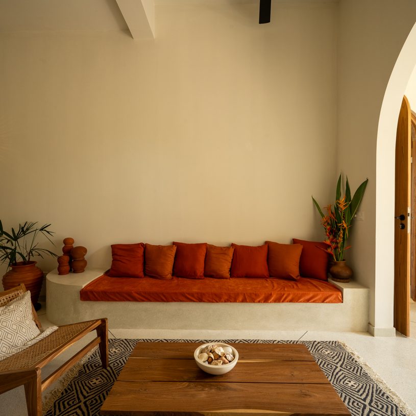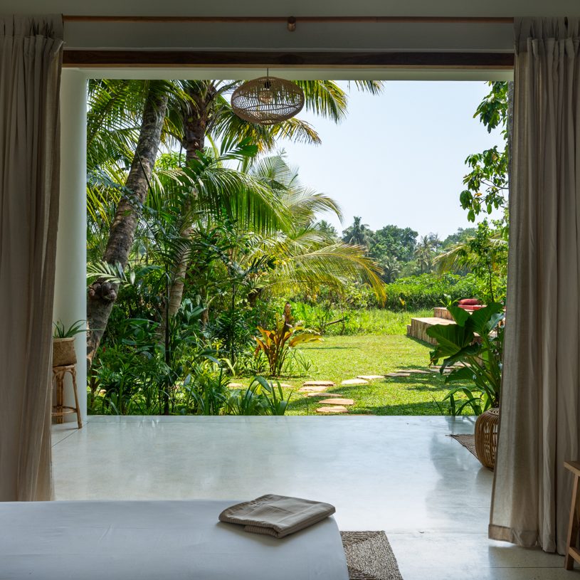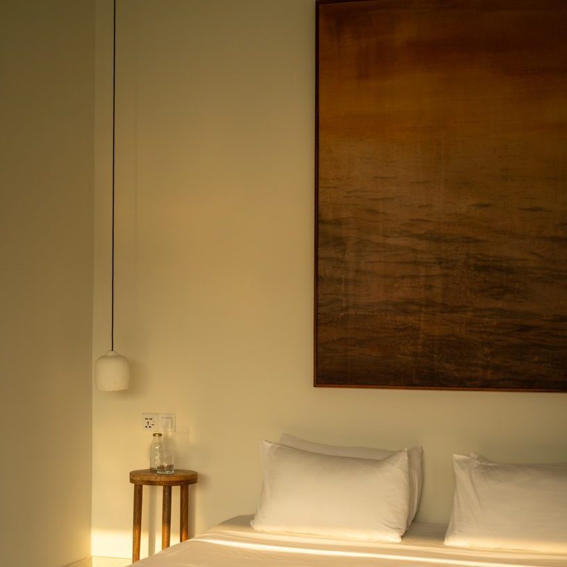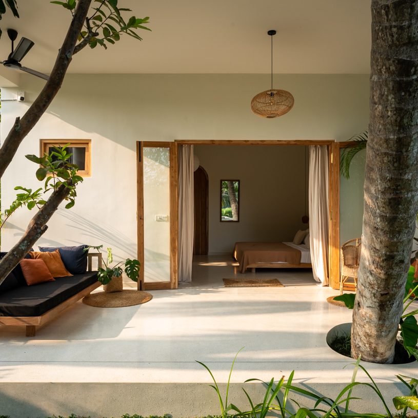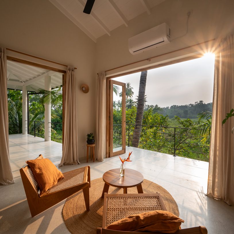 Nestled atop the mango tree our most spacious room comes with four single beds. It’s furnished with handmade pieces, and has an en-suite bathroom. The attached balcony seamlessly connects to the airy Yoga Shala with a kitchenette and a lounge space, overlooking the paddies and the lush garden with an infinity pool.